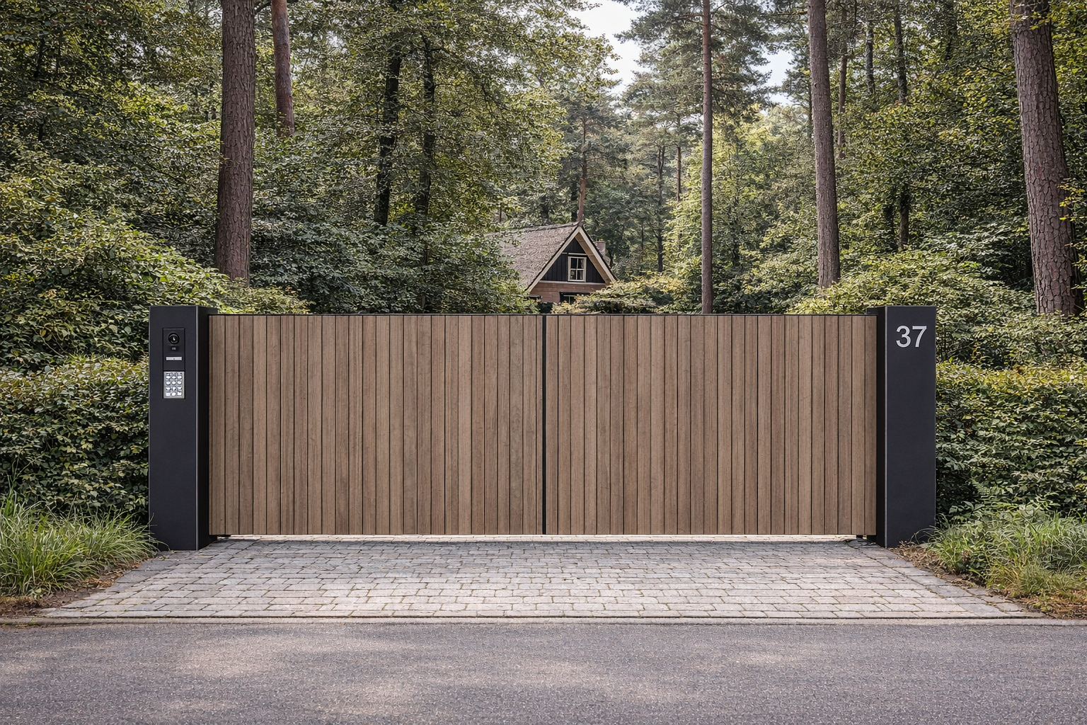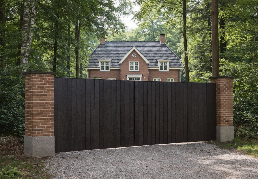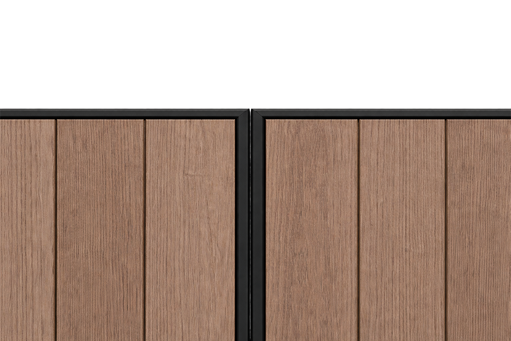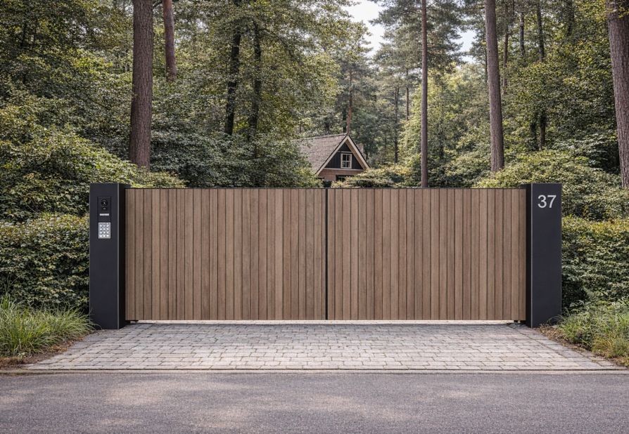Waar open lijnen soms transparantie zoeken, kiest Timber bewust voor geslotenheid. De verticale houten delen vormen één harmonieus vlak en zorgen voor optimale privacy, zonder massief of zwaar te ogen. De slanke stalen randen geven de poort een strak kader en onderstrepen het hoogwaardige karakter van het ontwerp.